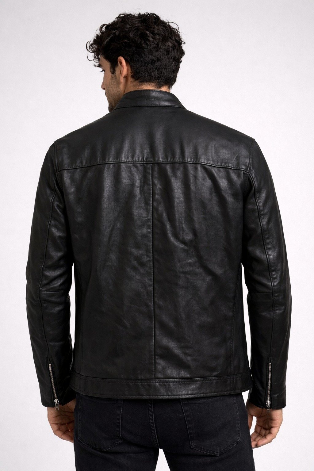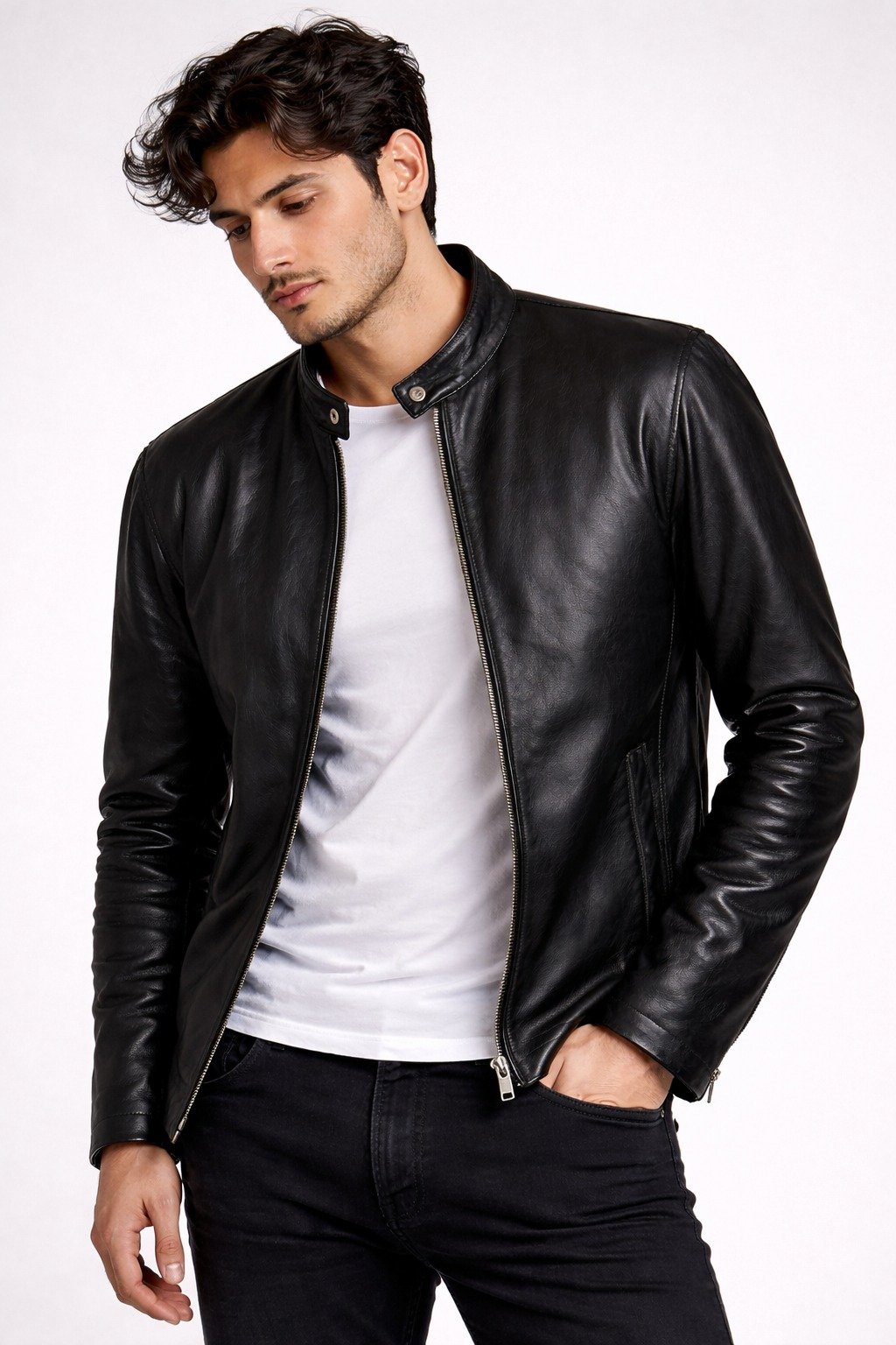 Crafted from premium real leather, this black biker jacket embodies sleek simplicity with a modern edge. Designed with a clean, streamlined silhouette, it features a classic stand collar with snap button detail and a smooth front zipper closure. Its minimal design makes it a versatile wardrobe essential—perfect for both casual and smart-casual styling.