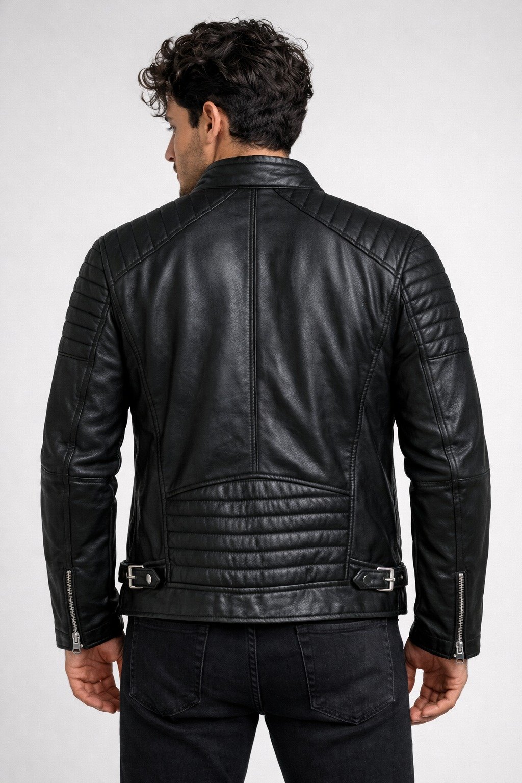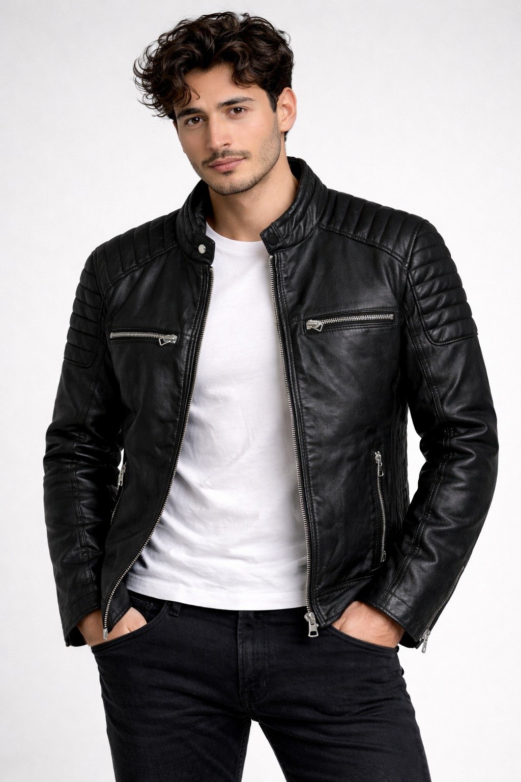 Crafted from premium real leather, this black biker jacket delivers a bold and edgy look with a modern twist. Featuring quilted shoulder detailing, a sleek stand collar, and multiple zipper pockets, it combines rugged style with everyday functionality. Perfect for elevating your streetwear or casual outfits with confidence.