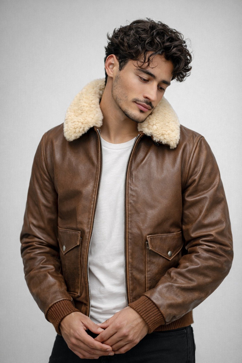 Crafted from premium real leather, this brown bomber jacket combines rugged durability with timeless style. Featuring a plush shearling collar, smooth front zipper, and spacious flap pockets, it delivers both warmth and everyday functionality. Perfect for colder days, this jacket adds a bold yet refined touch to your casual wardrobe.