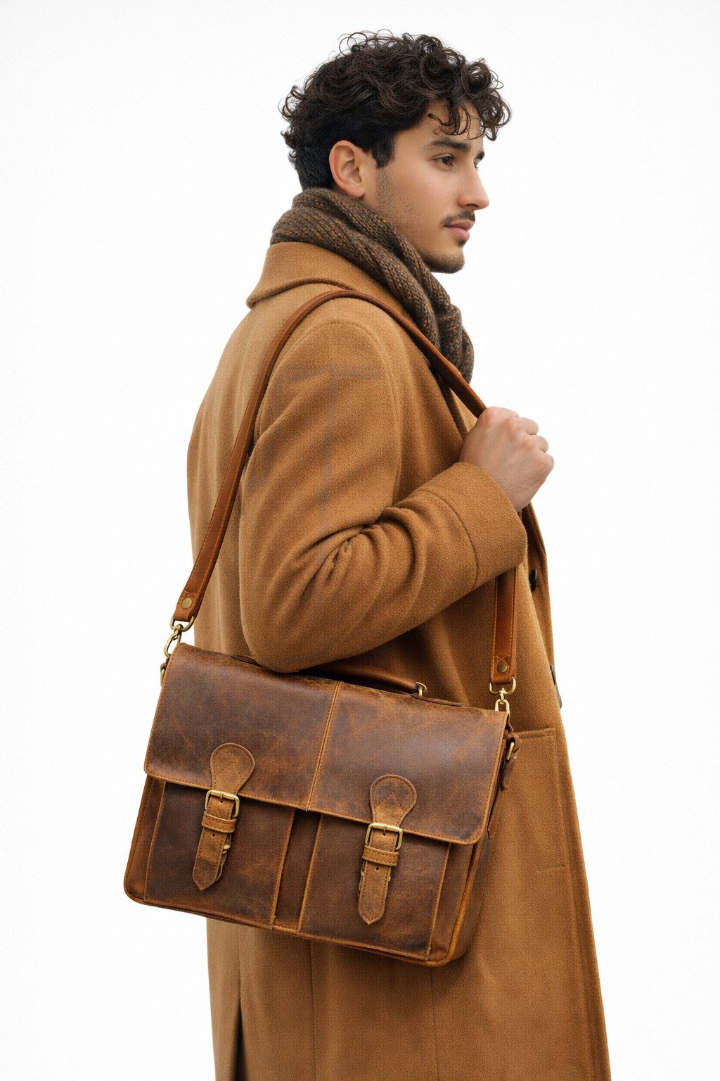 Upgrade your everyday carry with this Vintage Brown Leather Satchel Bag, crafted for those who value both style and durability. Made from premium leather with a rich distressed finish, this bag delivers a rugged yet sophisticated look that stands the test of time. Designed for work, travel, or daily use, it offers practical storage with a classic flap and buckle design for added security and vintage charm.