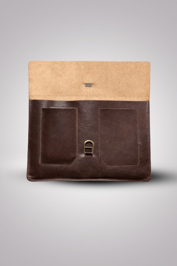 Vintage dark brown leather laptop bag with a slim portfolio design and secure buckle closure—perfect for office, meetings, and professional use.