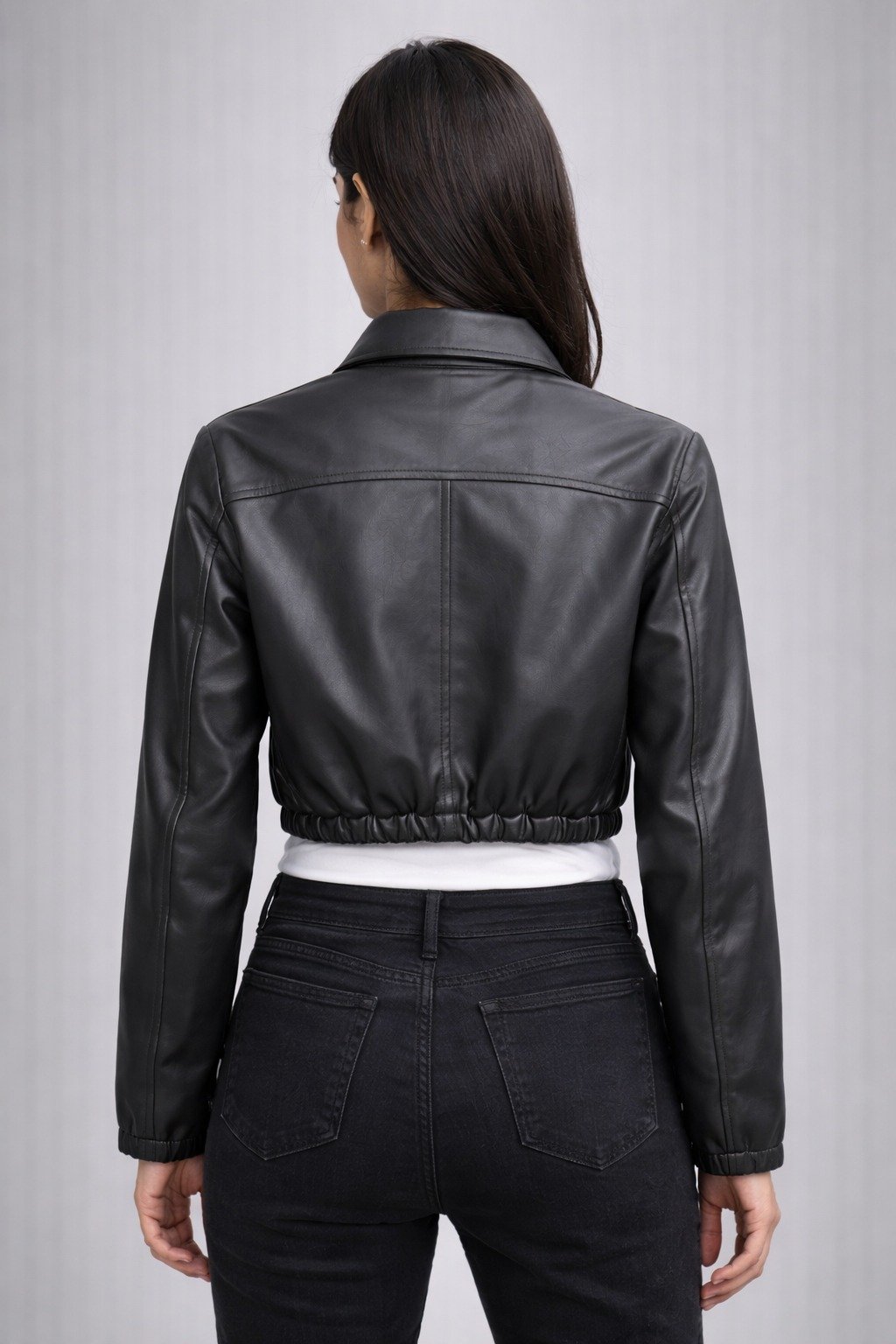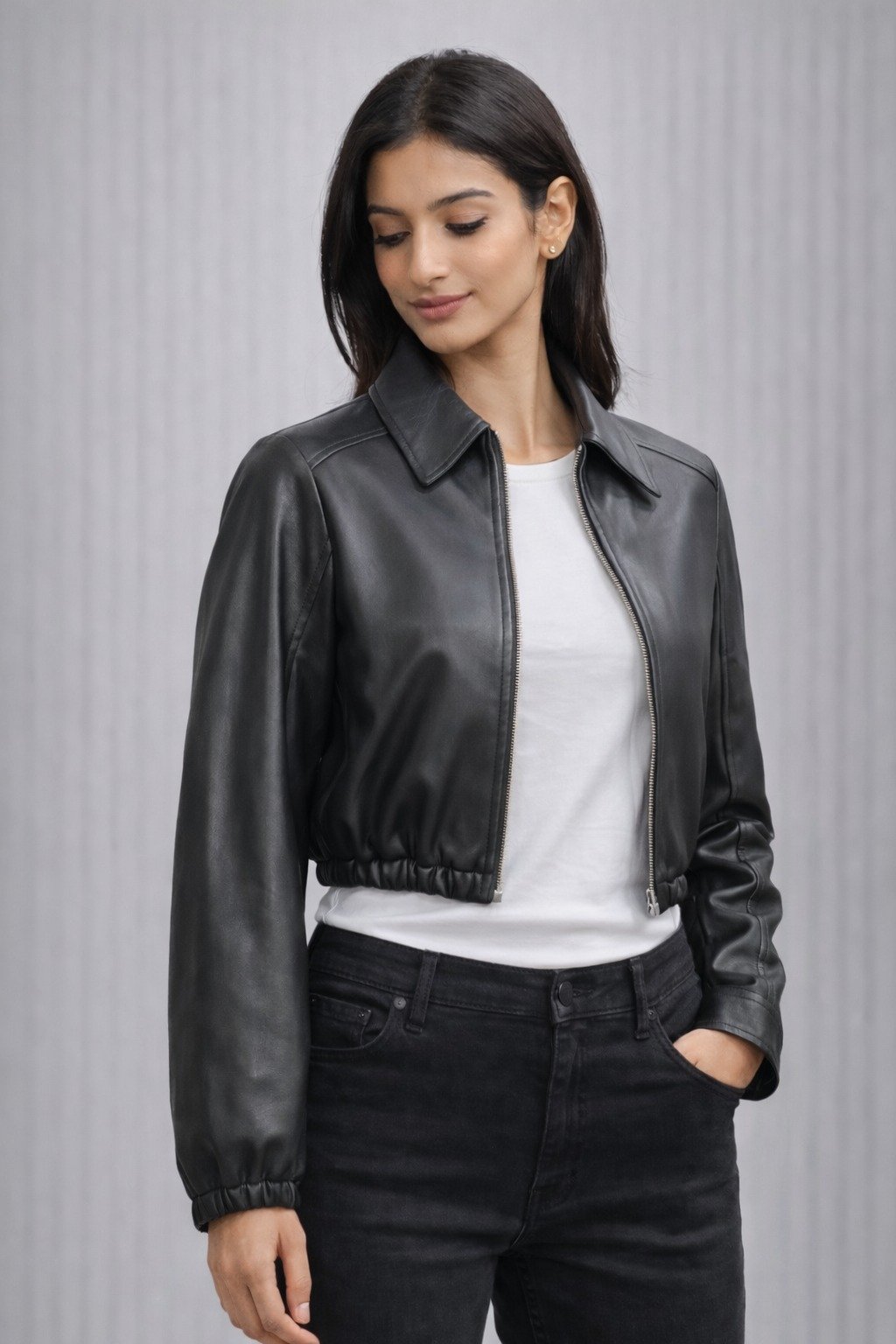 Crafted from premium real leather, this black cropped jacket delivers a modern edge with effortless sophistication. Designed in a flattering slim-fit silhouette, it features a classic shirt-style collar and a sleek front zipper closure. The cropped length with an elasticized hem adds a contemporary touch, making it perfect for pairing with high-waisted jeans or skirts for a chic, everyday look.