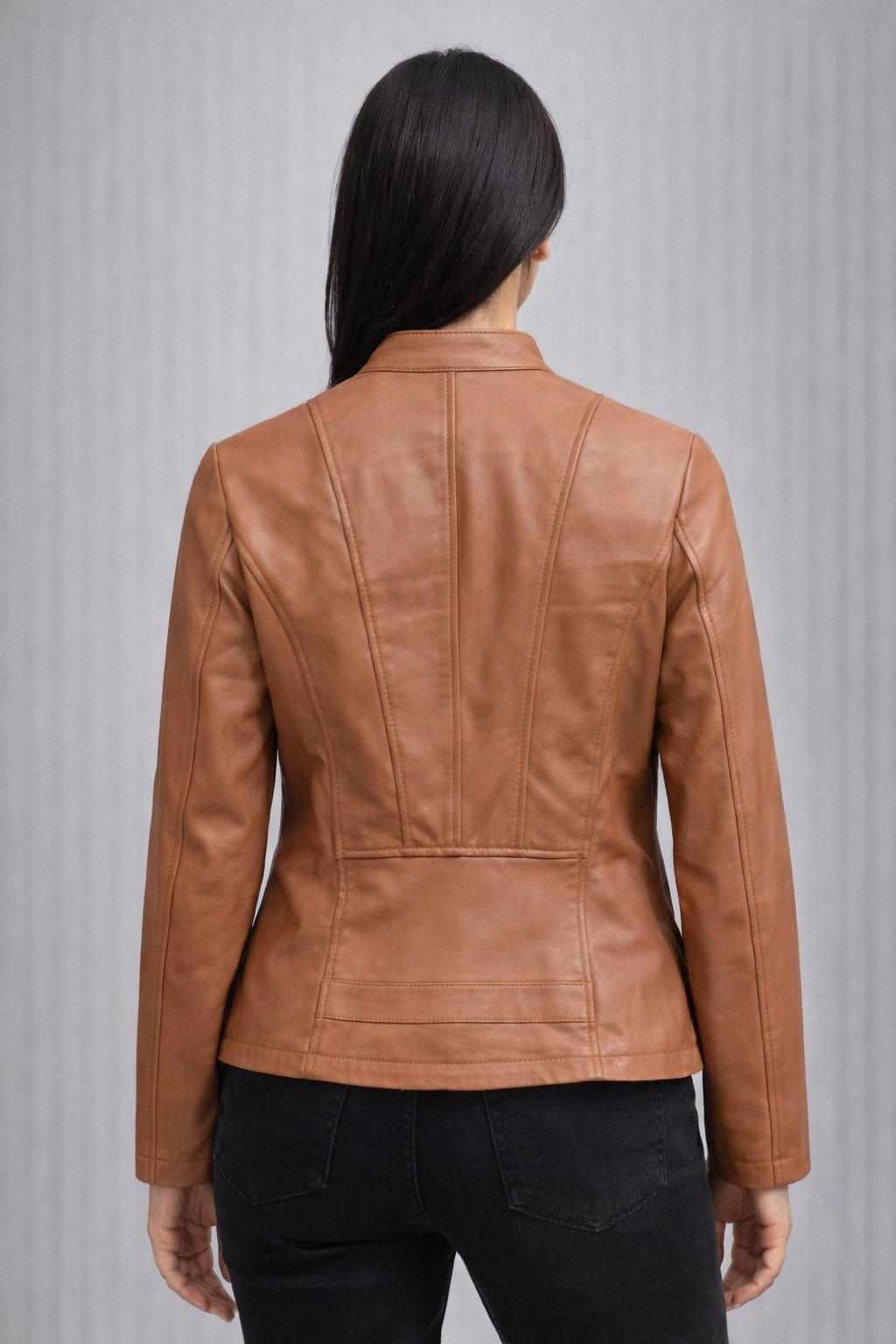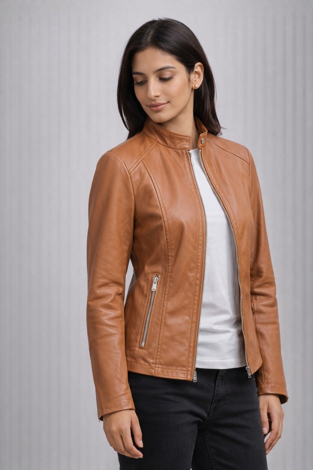 Crafted from premium real leather, this tan jacket offers a perfect blend of elegance and everyday versatility. Designed with a flattering slim-fit silhouette, it features a sleek stand collar with snap button detail and a clean front zipper closure. The warm tan tone adds a sophisticated touch, making it an ideal choice for both casual and semi-formal styling.